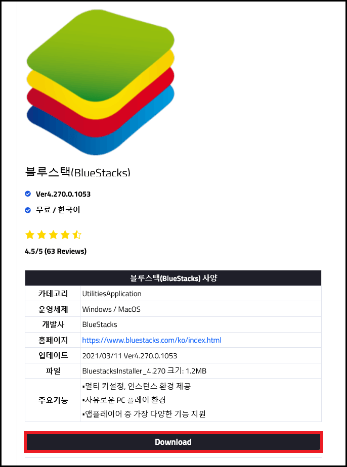 블루스택 설치를 위해 다운로드를 눌러 주세요.
