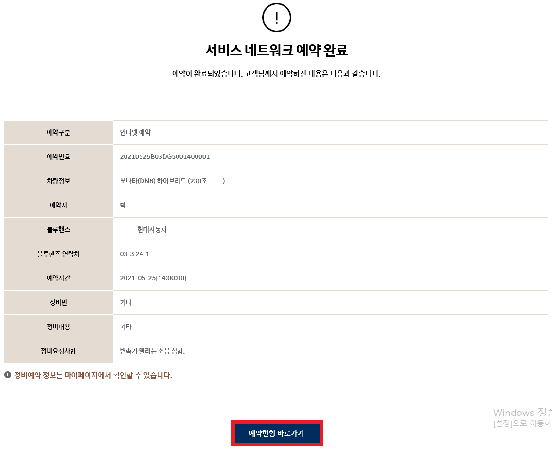 현대자동차 서비스센터 블루핸즈 서비스 사전 예약이 완료되었습니다. 날짜와 시간 방문할 블루핸즈점이 맞는지 확인 후 예약 현황 바로가기를 눌러 주세요. 정비 예약 정보는 마이페이지에서 확인할 수 있습니다.