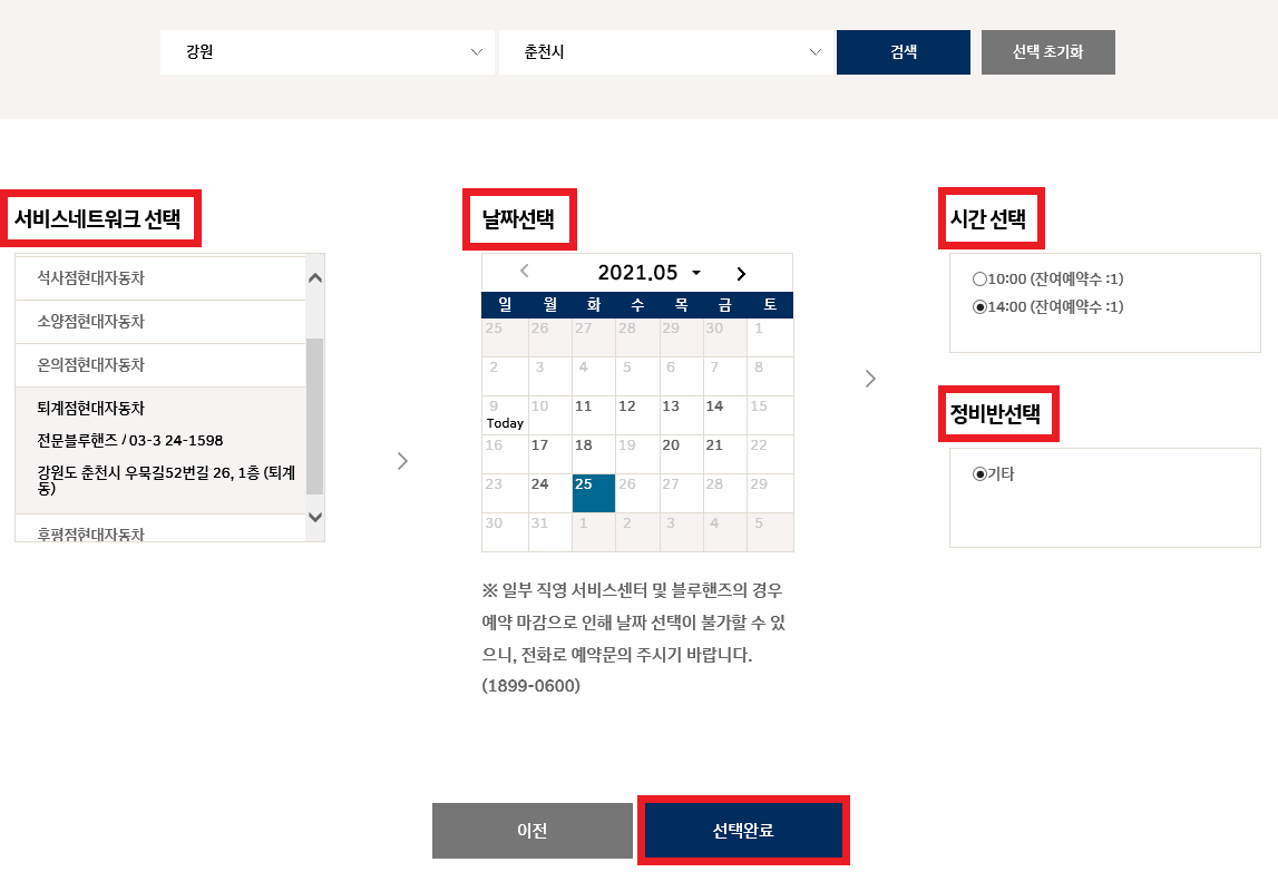 간단한 전화 한 통으로 정비 시간을 절약할 수 있고 전문 상담원이 점검받아볼 지역에서 가장 가까운 서비스센터나 블루핸즈를 검색하여 원하는 날짜와 시간에 맞춰 예약을 해주십니다.