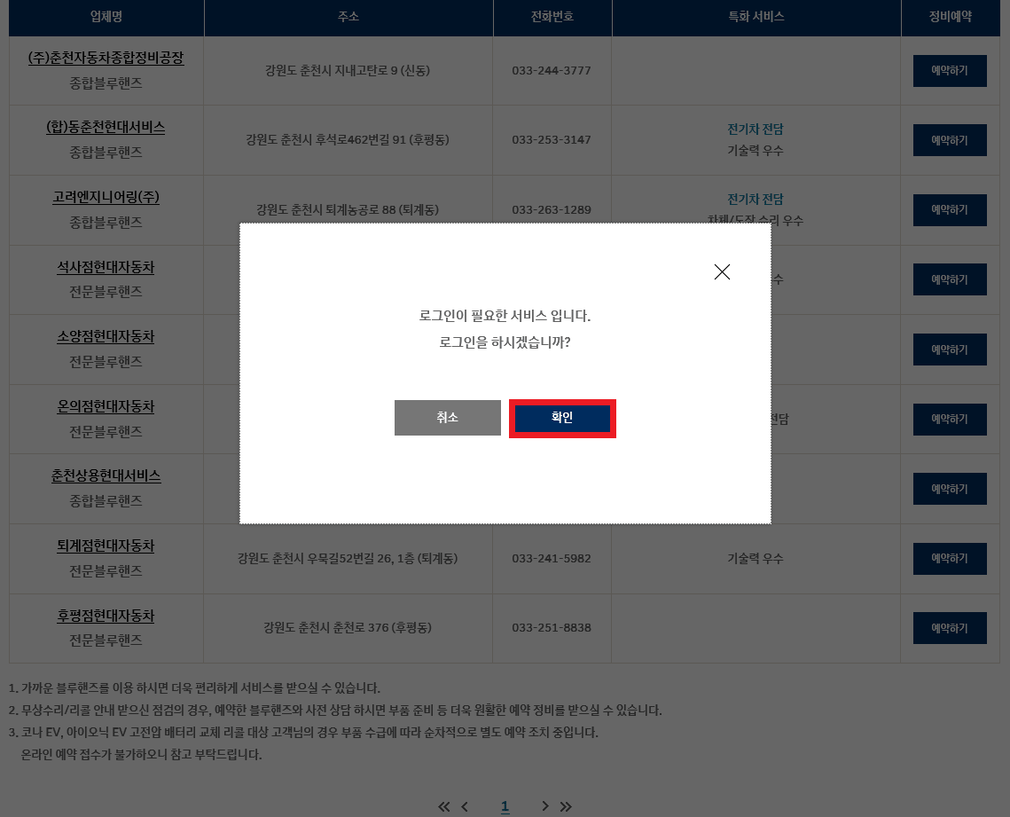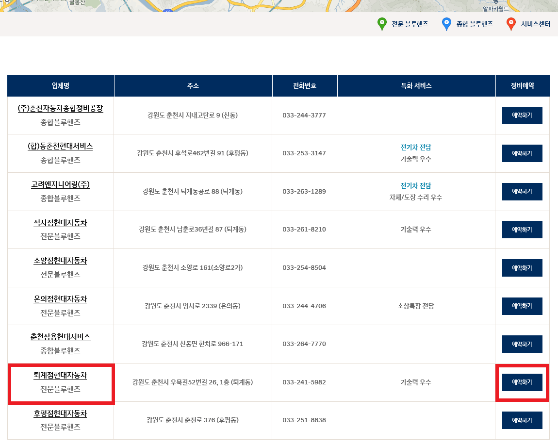 로그인이 되었다면 지역에서 가장 가까운 블루핸즈를 확인하고 예약하기를 눌러 주세요.