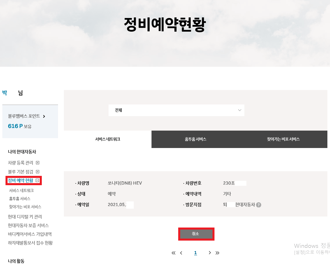5. 현대자동차 서비스센터 정비 예약 취소하기