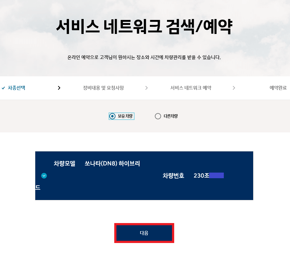 온라인 예약 화면으로 아래 보유하고 있는 차량이 맞는지 확인하고 다음을 눌러주세요. 보유하신 차량이 2대~3대라면 차량번호를 한번 더 확인해 주시고, 등록이 안되었다만 보유차량 옆에 있는 다른 차량을 클릭하여 차량번호를 입력하여 주시면 됩니다.