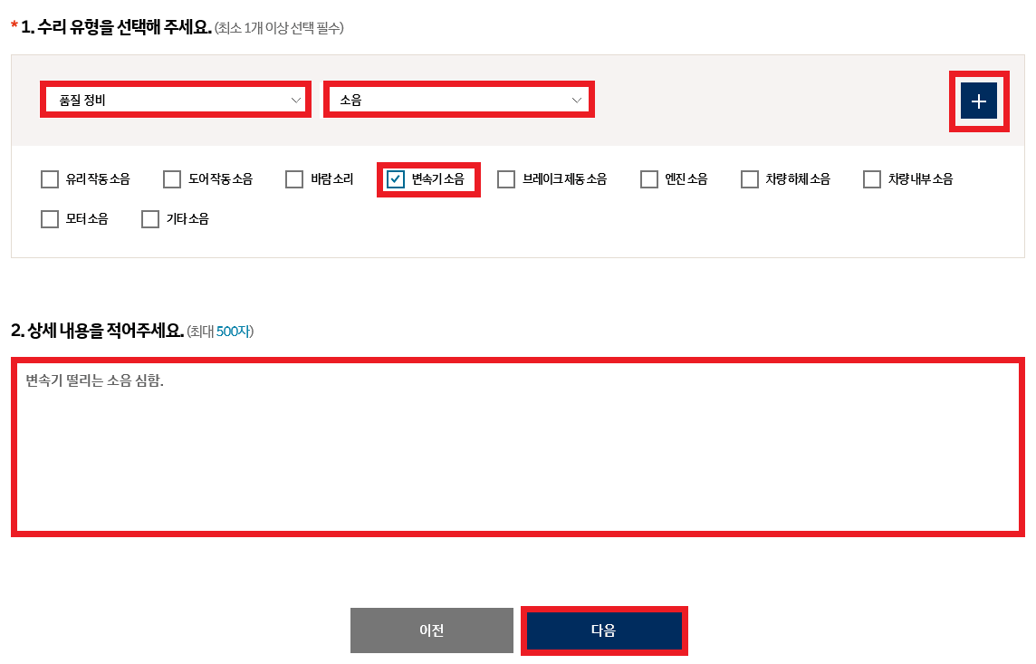 다음으로 차량 정비 내용을 선택해야 합니다. 수리유형(일반정비, 리콜/무상정비, 품질 정비)중 1개를 선택하여 주시고 아래 상세 내용을 적어 주시면 점검하는데 도움이 될 수 있습니다. 고장 증상이 더 있다면 우측에 있는 +를 눌러 정비내용을 추가할 수 있으니 참고해 주세요. 다음을 눌러 주세요.