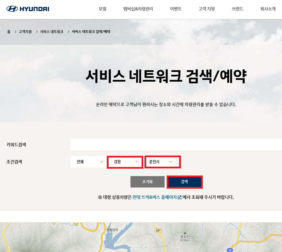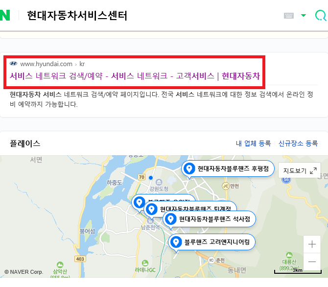 첫 번째로 인터넷 포털사이트에 현대자동차서비스센터를 검색 후 눌러 주세요.