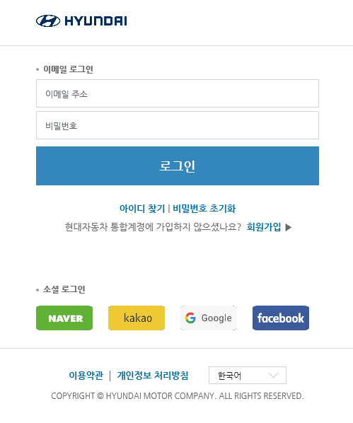 현대자동차서비스센터 로그인을 위해 이메일 주소, 비밀번호를 눌러 주세요. 가입이 되어 있지 않다면 아래 네이버, 카카오, 구글, 페이스북 계정으로도 로그인이 가능하니 참고하여 주세요.