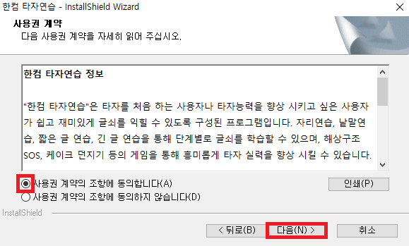 실행 후 한컴타자연습 설치를 위해 다음을 눌러 주세요.