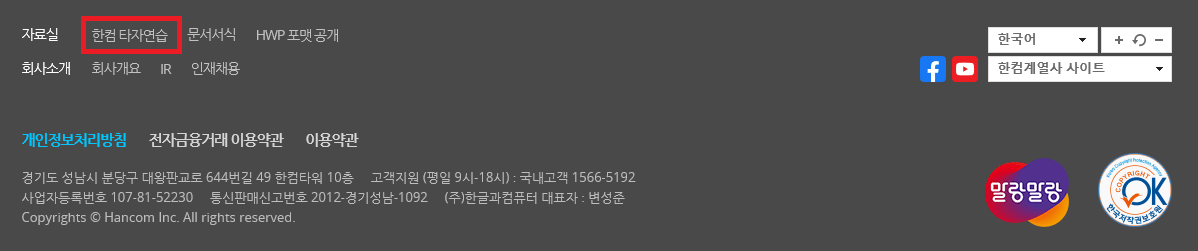 한글과 컴퓨터 홈페이지 화면입니다. 맨 아래로 내려가 좌측 자료실 옆 한컴타자연습을 눌러 주세요.