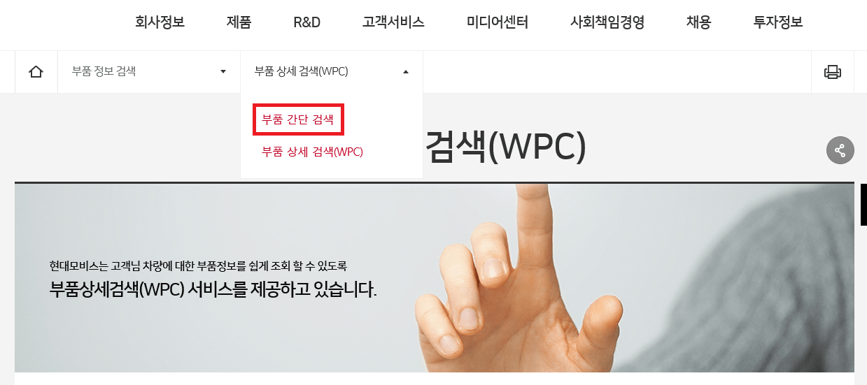 다음으로 부품 상세 검색(WPC)에서 부품 간단 검색을 눌러 주세요.