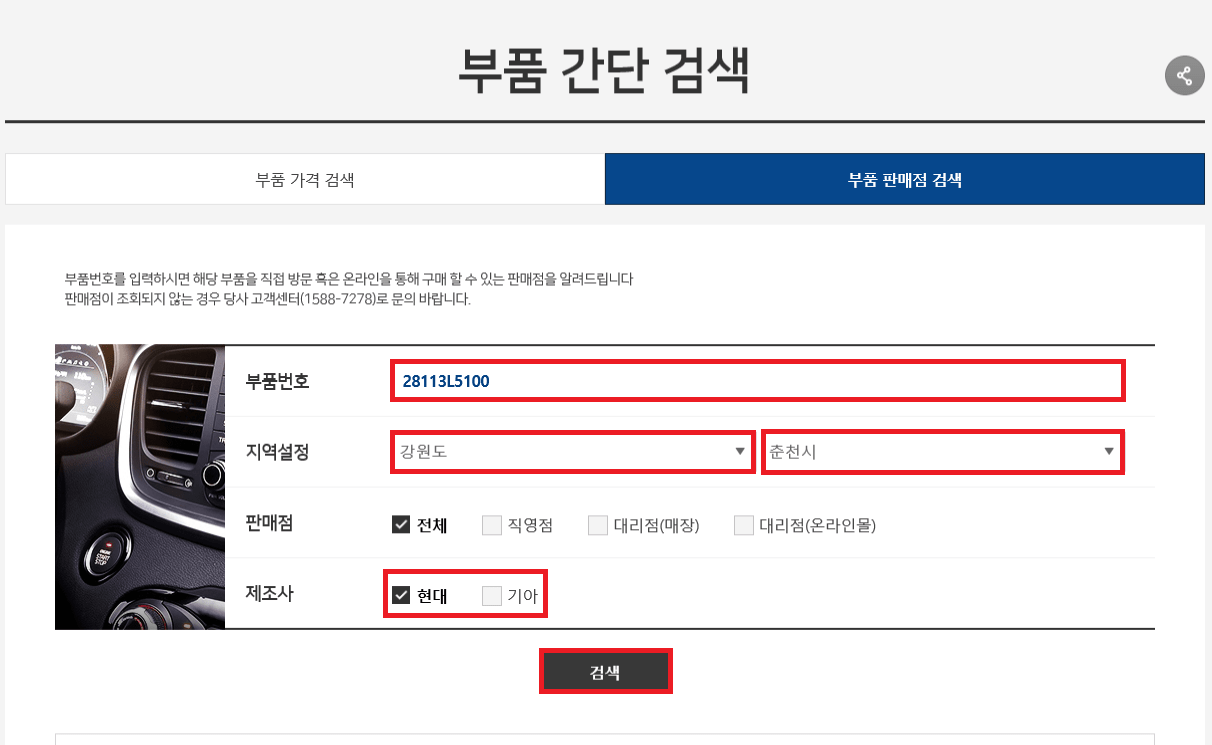 부품 간단 검색 화면으로 아래 부품번호, 지역 설정, 판매점, 차량 제조사를 입력해 주고 검색을 눌러주세요.