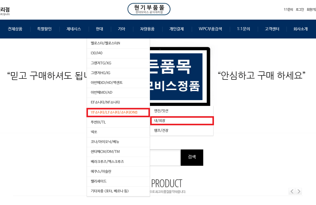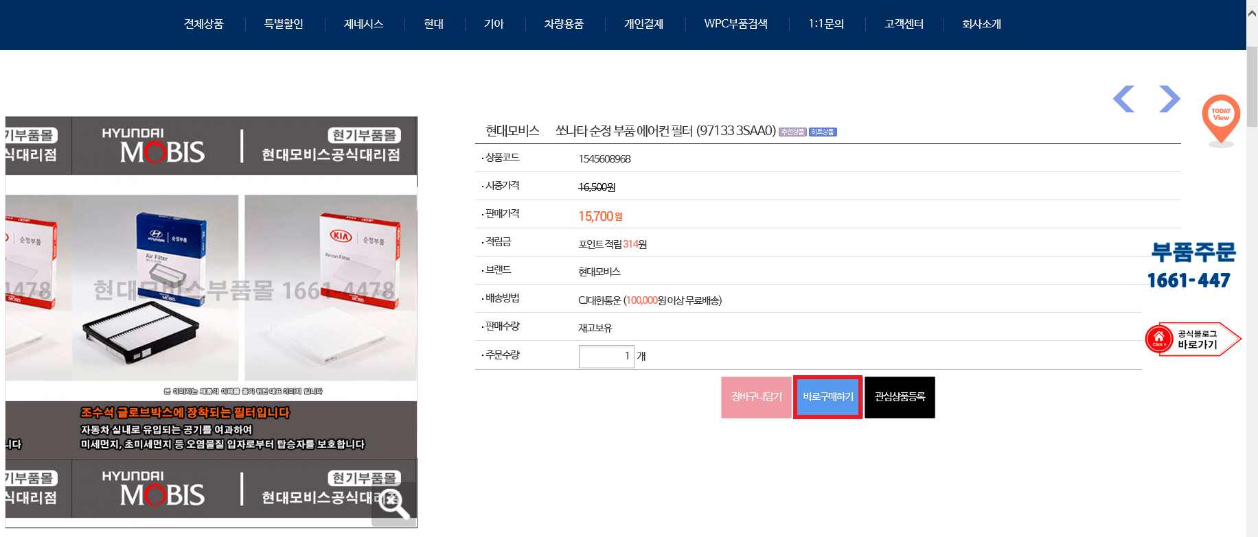 자주 이용하는 쇼핑몰은 현기 부품 몰인데요. 이곳에서는 1:1 문의 게시판을 통해 부품 문의/부품 주문이 가능하며 내차량에 맞는 부품 찾기 서비스로 차량에 대한 부품 정보를 쉽게 조회할 수 있습니다. 또한 부품 상세검색 서비스는 정확한 부품번호를 알 수 있어 내 지역에 있는 현대모비스 부품대리점, 기아자동차 부품대리점에서 부품번호로 쉽게 구매 가능합니다.