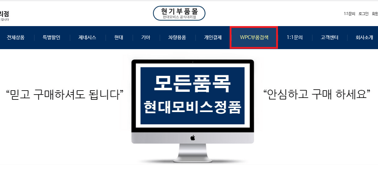 첫 번째로 현기 부품몰 우측 상단에 WPC부품 검색을 눌러 주세요.