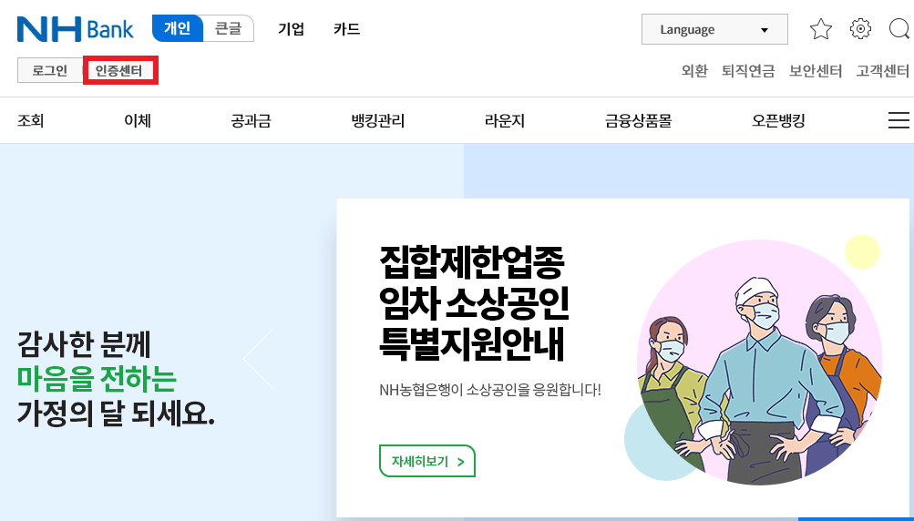 농협 홈페이지 상단에 인증센터를 클릭해 주세요.