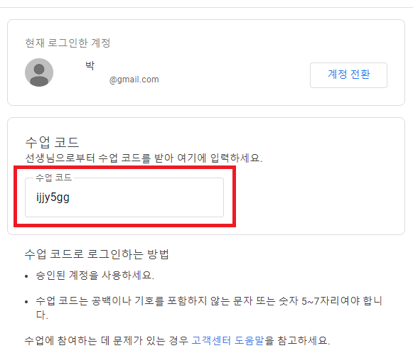 1. 수업 코드 : 선생님이 수업 코드를 보내거나 알려 주십니다.