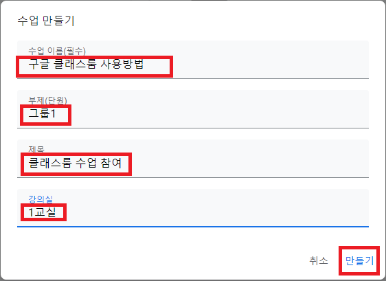 그러면 나만의 수업 만들기 창이 생성이 되고, 수업 이름(필수), 부제(단원), 제목, 강의실 입력란에 형식에 맞게 입력 후 만들기를 클릭해 주면 됩니다.
