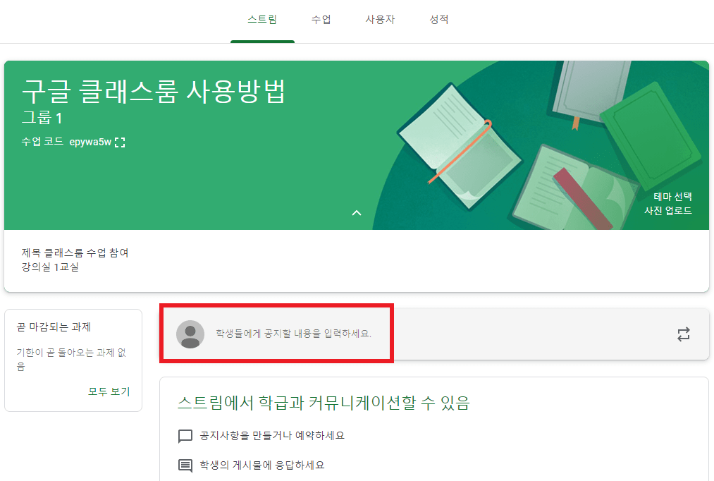클릭 후 본인이 개설한 나만의 클래스룸이 만들어졌습니다.