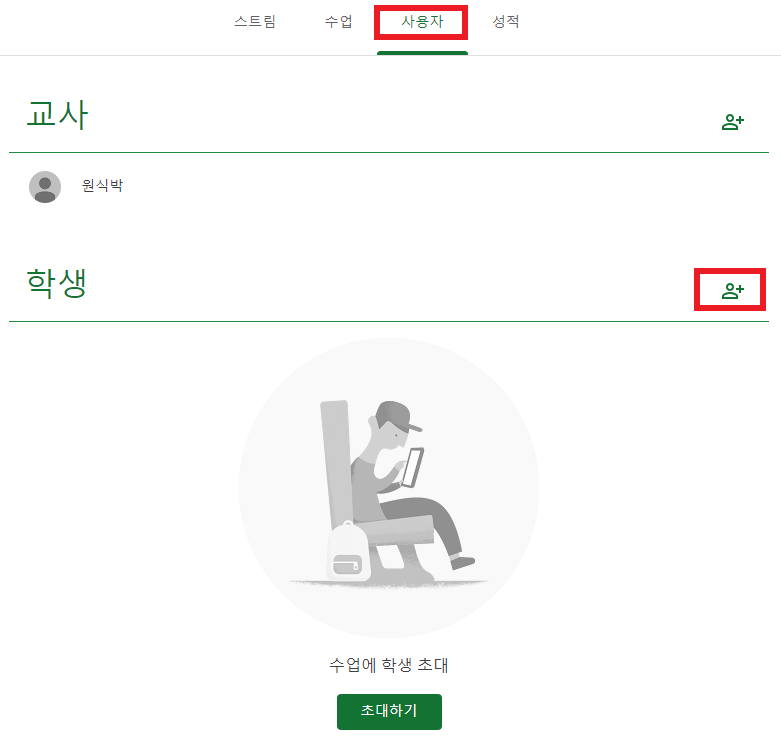 이메일 통해 학생을 초대하라면 상단 메뉴에 사용자를 클릭 후 우측 하단에 사람 모양에 +를 클릭해 주면 됩니다.