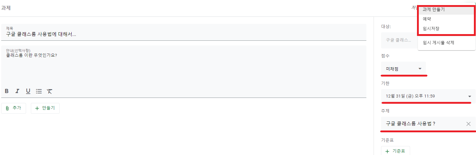 과제 만들기 눌러봤더니 우측에 점수를 100점, 미채점으로 변경할 수 있고, 제출 기한 설정이 가능하며, 주제도 입력이 가능합니다. 입력 후 예약을 설정하거나 과제 만들기를 클릭해 주면 과제가 생성이 됩니다.