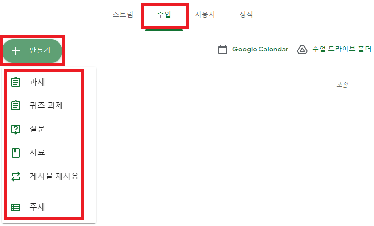 다음으로 상단 메뉴에 수업을 클릭하고 왼쪽에 만들기를 클릭하면 과제, 퀴즈 과제, 질문, 자료, 게시물 재사용 등이 보입니다. 만들고자 하는 과제를 선택하여 게시물을 업로드 할 수 있습니다.