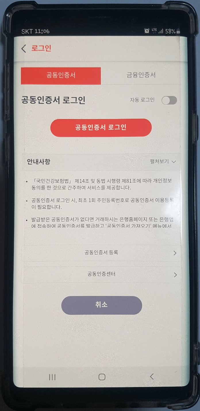 공동ㆍ금융인증서 로그인 화면으로 PC 로그인과 동일하게 모바일에 설치되어 있는 공동ㆍ금융인증서로 로그인해주세요.