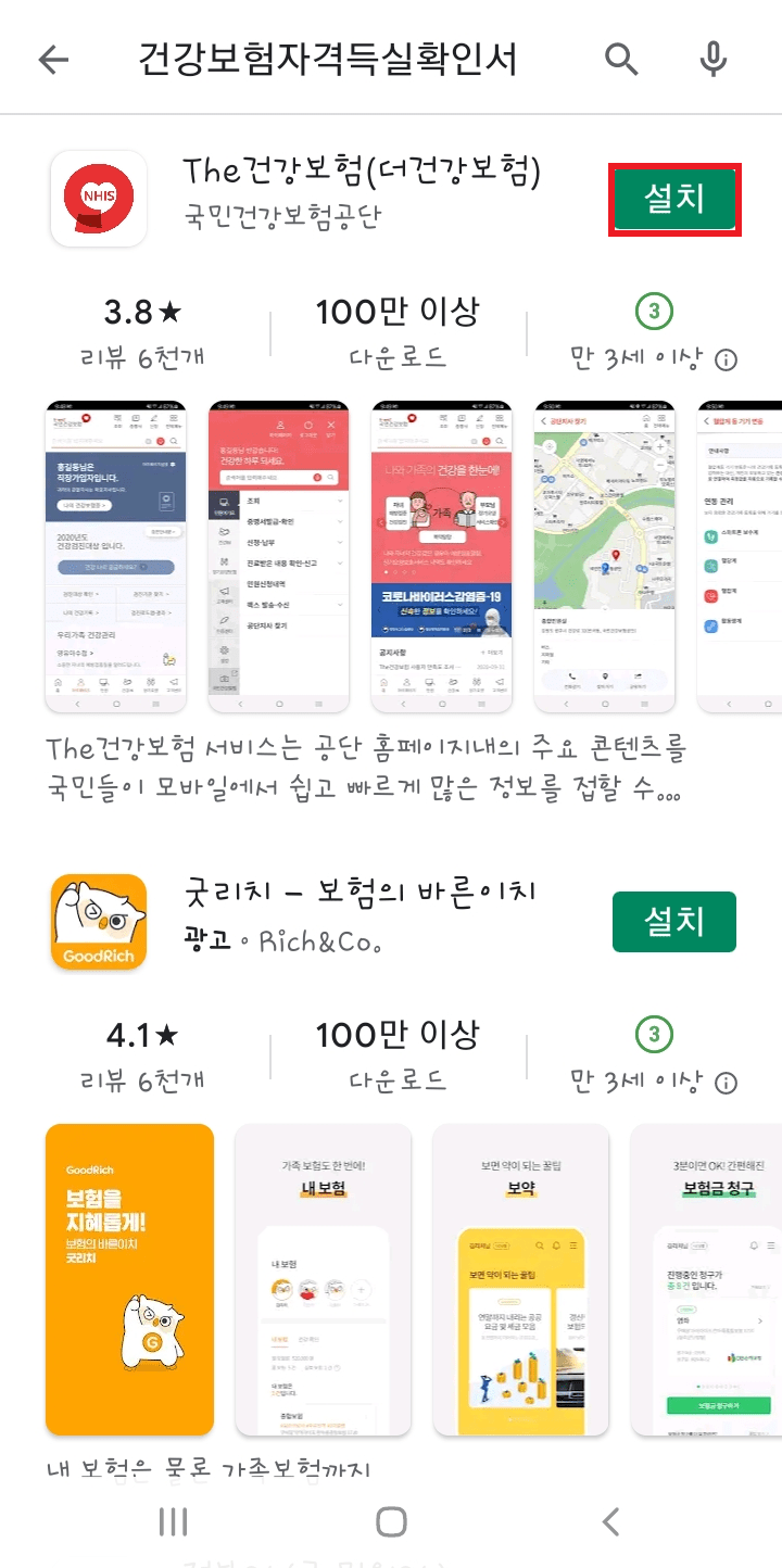 모바일 앱을 설치하고 로그인하려면 PC 동일하게 금융ㆍ공동 인증서가 필요합니다. 구글 플레이스토어나 애플 앱스토어에서 '건강보험자격득실확인서' 검색하고 설치를 클릭해 주세요. 설치가 완료되면 열기를 클릭해 주세요.