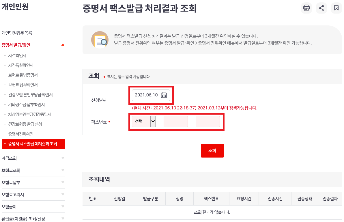 결과 확인은 민원 여기요 → 개인 민원 → 증명서 발급ㆍ확인 → 증명서 팩스발급에서 처리결과를 확인할 수 있고, 아래 신청 날짜 입력 및 팩스번호를 입력하고 조회하면 됩니다.