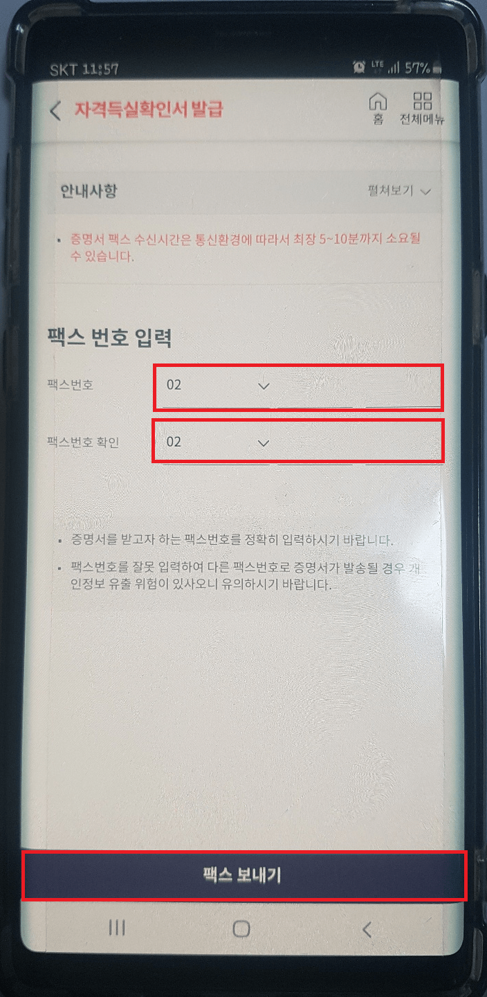 이제 증명서를 받을 팩스 번호를 정확하게 입력하고 팩스 보내기를 클릭해 주세요. 간혹 팩스번호가 잘못입력 되어 다른 곳으로 전송되는 경우가 있어 개인정보 유출에 문제가 생길 수 있습니다. 꼭 상대방 팩스번호를 확인하고 입력해 주시기 바랍니다. 입력 후 팩스보내기를 클릭하면 모바일 건강보험자격득실확인서 발급은 완료됩니다.