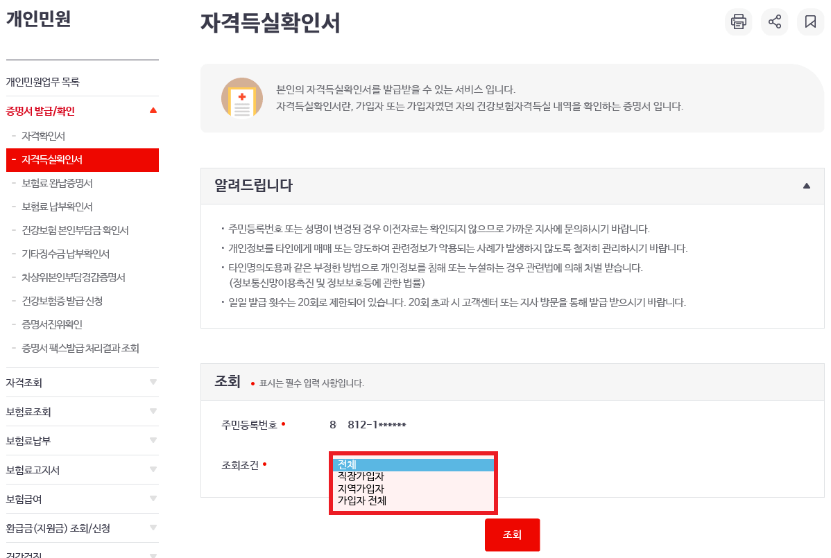 로그인 후 자격득실확인서를 조회할 수 있습니다. 아래 주민등록번호 밑에 조회 조건을 선택하고 조회를 클릭하여 주세요. 직장가입자, 지역가입자 전체 내역을 보고 싶다면 가입자 전체를 선택하고 조회하면 한 번에 조회할 수 있습니다.