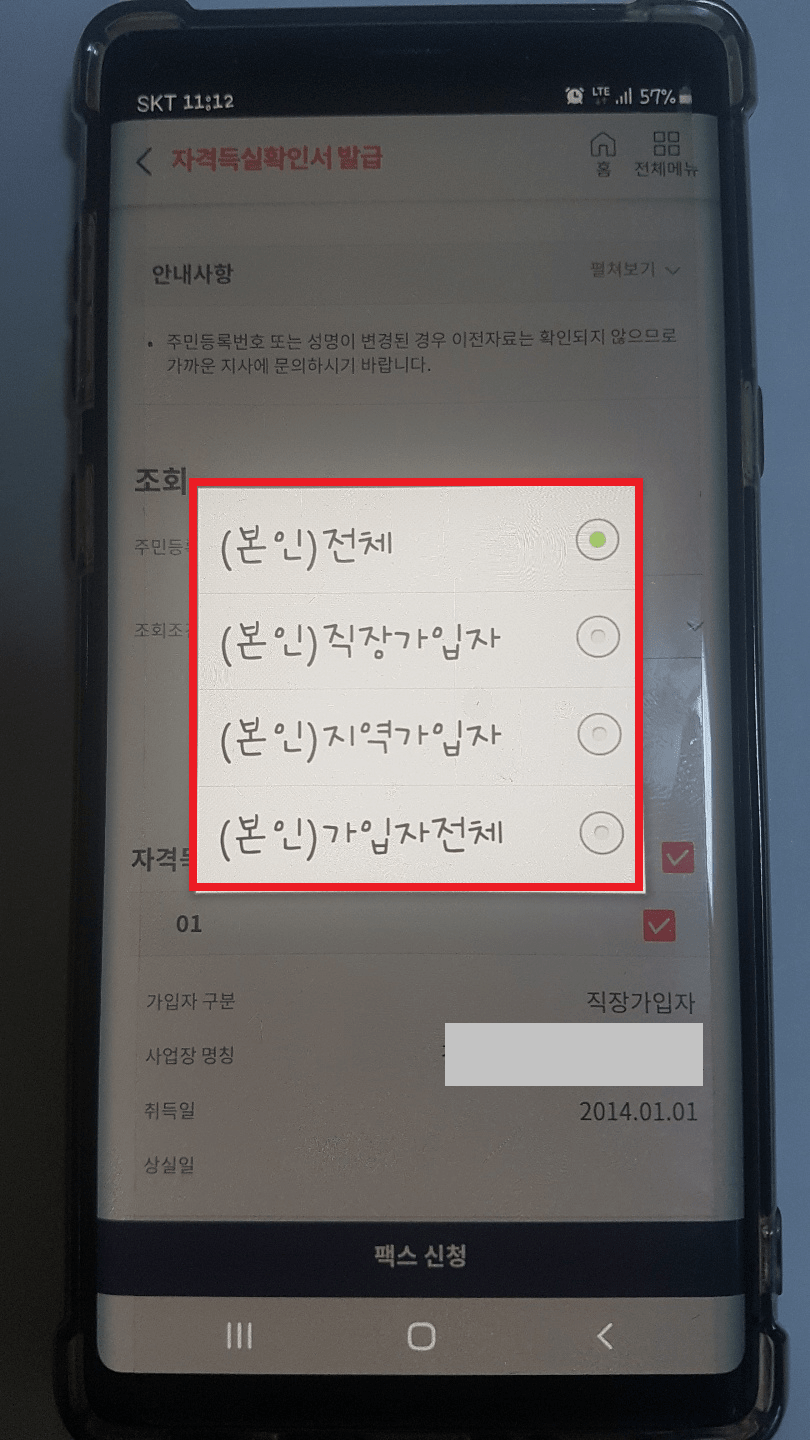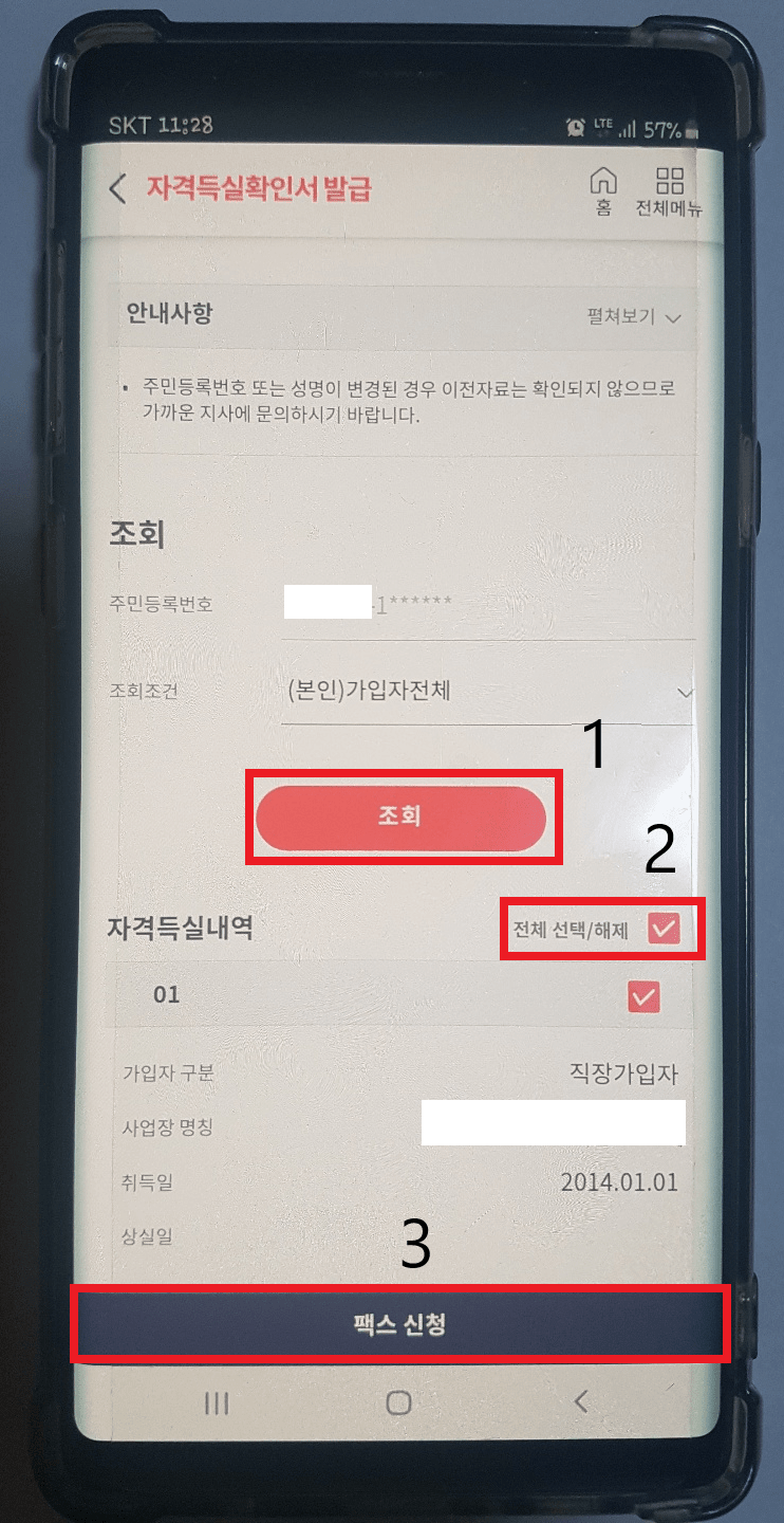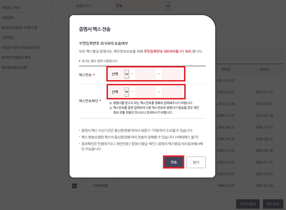 다음으로 조회 후 아래 자격득실내역 우측에 전체 선택/해제를 해주고 팩스 신청을 클릭해 주시면 됩니다.