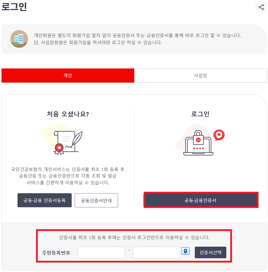 다음으로 로그인 화면으로 서비스를 이용하려면 금융ㆍ공동 인증서가 꼭 필요합니다. 개인회원은 별도의 회원가입 없이 공동 인증서 또는 금융인증서로 바로 로그인할 수 있습니다. 처음 방문하였다면 아래 주민등록번호를 입력하고 아래 인증서를 등록하여 주십시오. 1회 등록으로 각종 조회 및 발급 서비스를 간편하게 이용할 수 있습니다.
