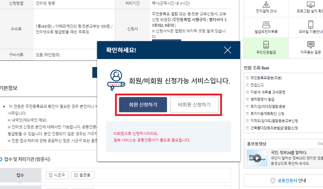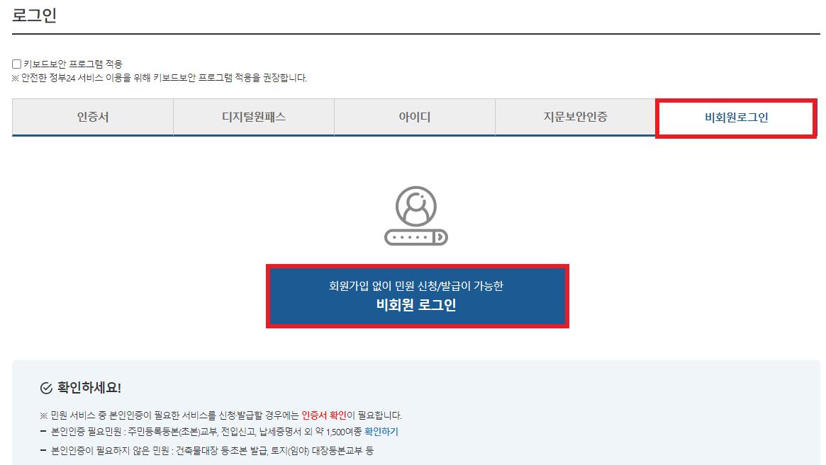 다음으로 로그인을 하려면 회원/비회원을 선택해야 합니다. 비회원으로 신청하더라도 본인인증이 필요한 서비스를 신청 발급할 경우에는 인증서 확인이 꼭 필요합니다. 선택 후 인증서를 등록하고 로그인 진행해 주세요.