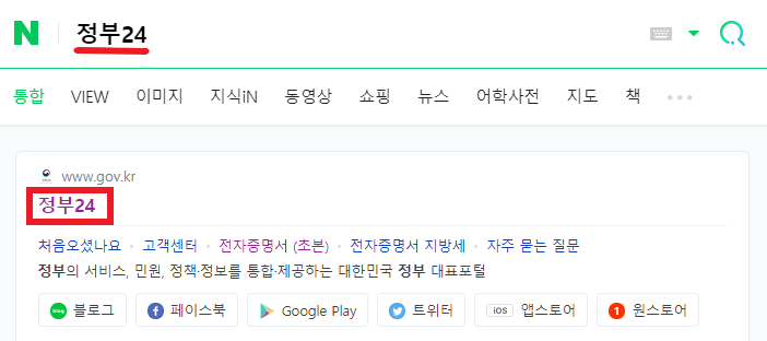 첫 번째로 자주 이용하는 인터넷 포털 사이트에 접속하여 '정부 24' 입력하고 검색 후 클릭해 주세요.