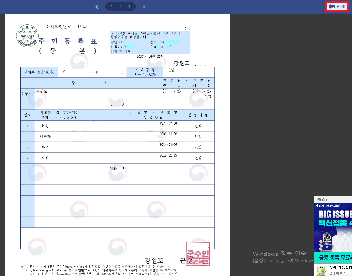 문서 출력 후 민원서류 발급 창이 뜹니다. 우측 상단에 인쇄 버튼을 클릭하면 주민등록등본 발급이 완료됩니다.