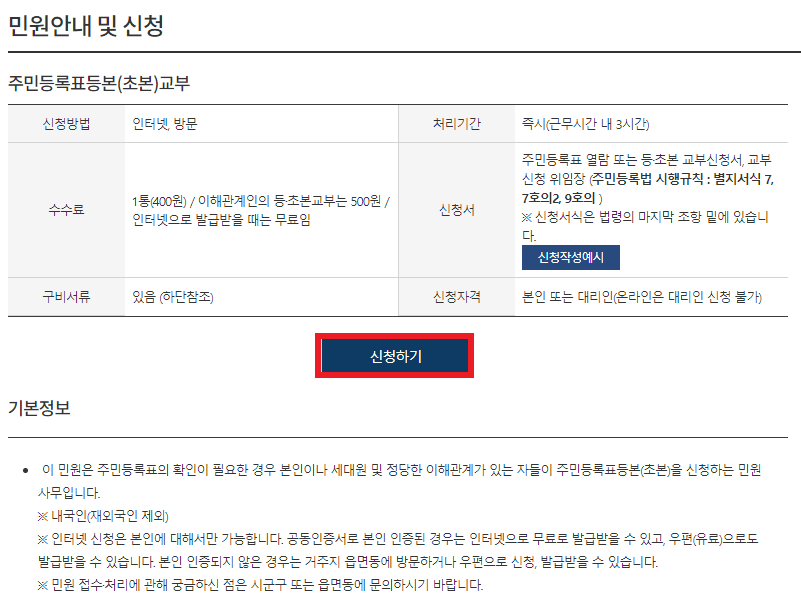 프린터 확인 후 민원안내 및 신청 화면으로 돌아와 주민등록신청을 발급을 하기 위해 아래 신청하기를 클릭해 주세요.