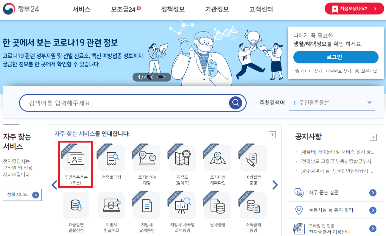 정부 24는 해당 방문 없이 인터넷 접속하여 언제 어디서든 민원서류를 신청, 발급받을 수 있으며, 정부 24를 통해 1,500종의 민원신청이 가능한데요, 오늘은 이중 제일 많이 발급되고 제출용으로 많이 사용되고 있는 주민등록등본 인터넷으로 발급하는 방법 알려드리고자 합니다.