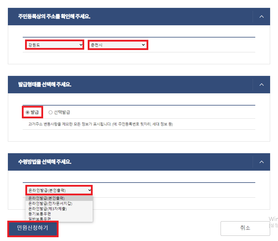 공인인증서(공동인증서)로 로그인이 되었다면 주민등록등본(초본) 교부 신청 화면에서 주민등록상의 주소 입력, 발급 형태, 수령방법을 선택하고 민원 신청하기를 클릭해 주세요.