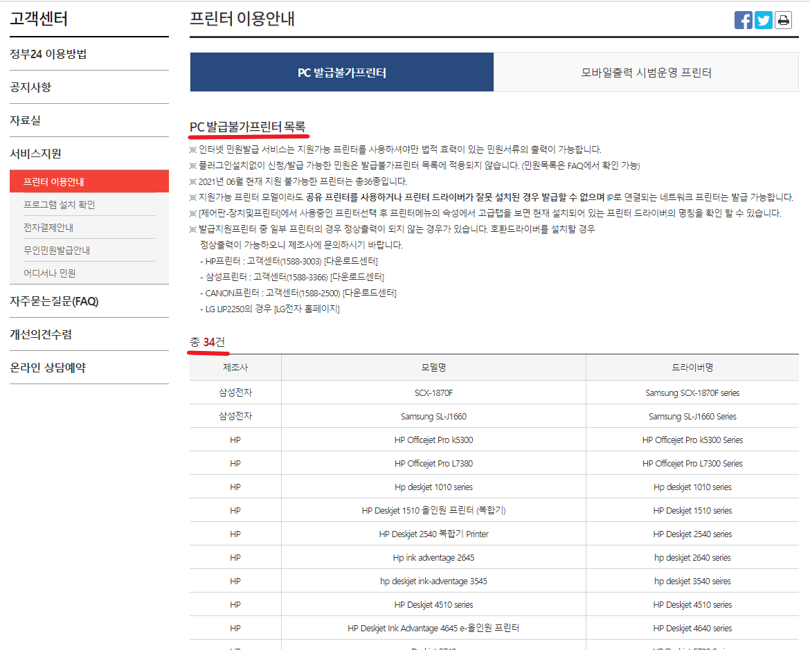 우측에 PC 발급 불가 프린터 목록이 보입니다. 2021년 6월 현재 민원발급이 불가능한 프린터는 총 36종이며, 지원 가능한 프린터 모델이라도 공유 프린터를 사용하거나 프린터 드라이버가 잘못 설치되어었다면 주민등록등본 발급을 할 수가 없습니다. 출력 가능한 프린터인지 꼭 확인해 주세요.