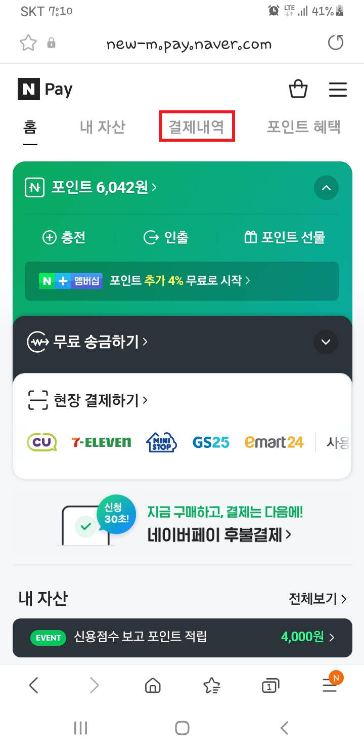 상단에 결제내역을 눌러 주세요.