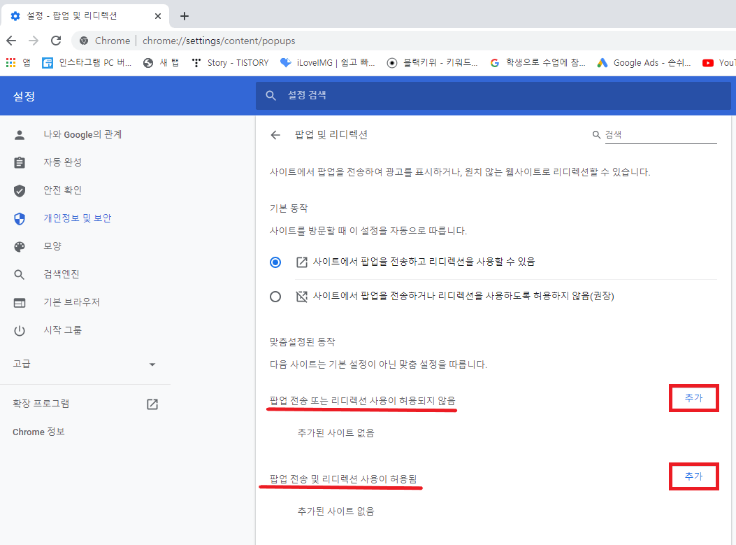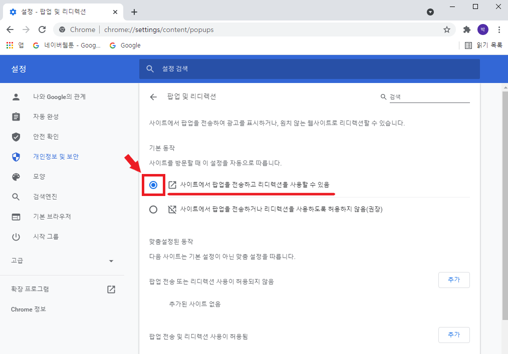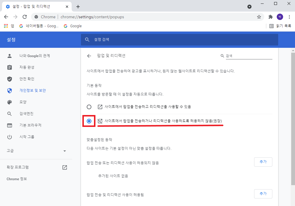 5. 현재 팝업 및 리디렉션 기본 동작 설정이 '현재 사이트에 팝업을 전송하거나 리디렉션을 사용하도록 허용하지 않음(권장)'으로 설정되어 있습니다.