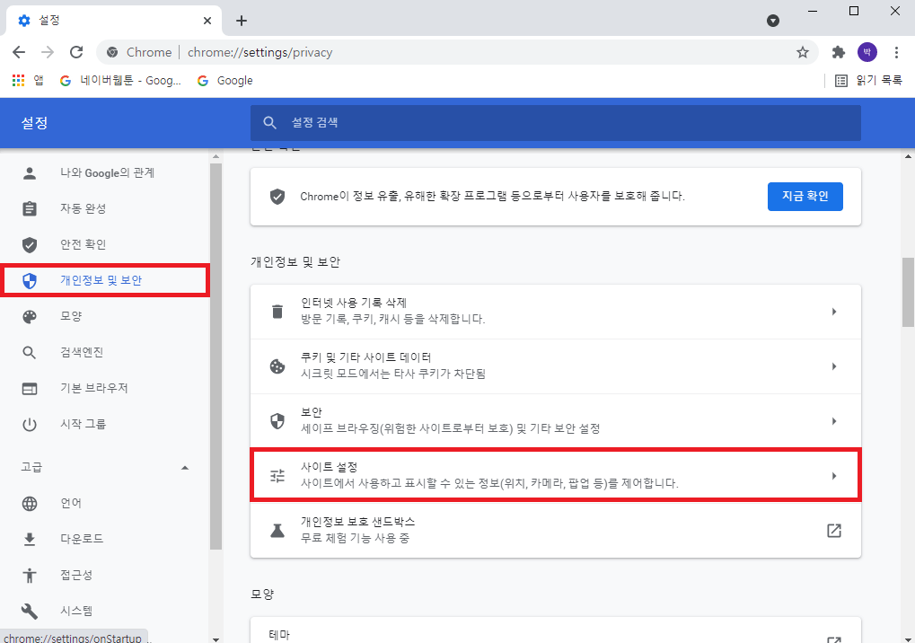 3. 설정 화면에서 좌측 아래 '개인정보 및 보안' → 우측에 '사이트 설정'을 눌러 주세요.