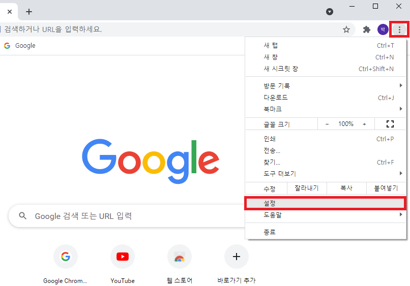 2. 구글 크롬 브라우저 화면에서 우측 상단에 더보기 점 3개 아이콘을 누른 후 메뉴에서 아래 '설정'을 눌러 주세요.