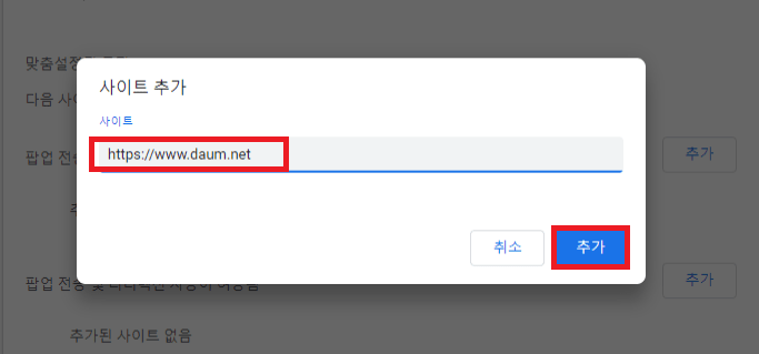 '허용되지 않음'에 추가 버튼을 눌러 (예) '다음'을 입력하면 전체 허용 상태일 때 '다음'만 팝업이 차단이 됩니다. 반대로 '허용됨'에 추가 버튼을 눌러 (예) '네이버'를 입력했다면 해당 사이트인 네이버만 열리게 됩니다.