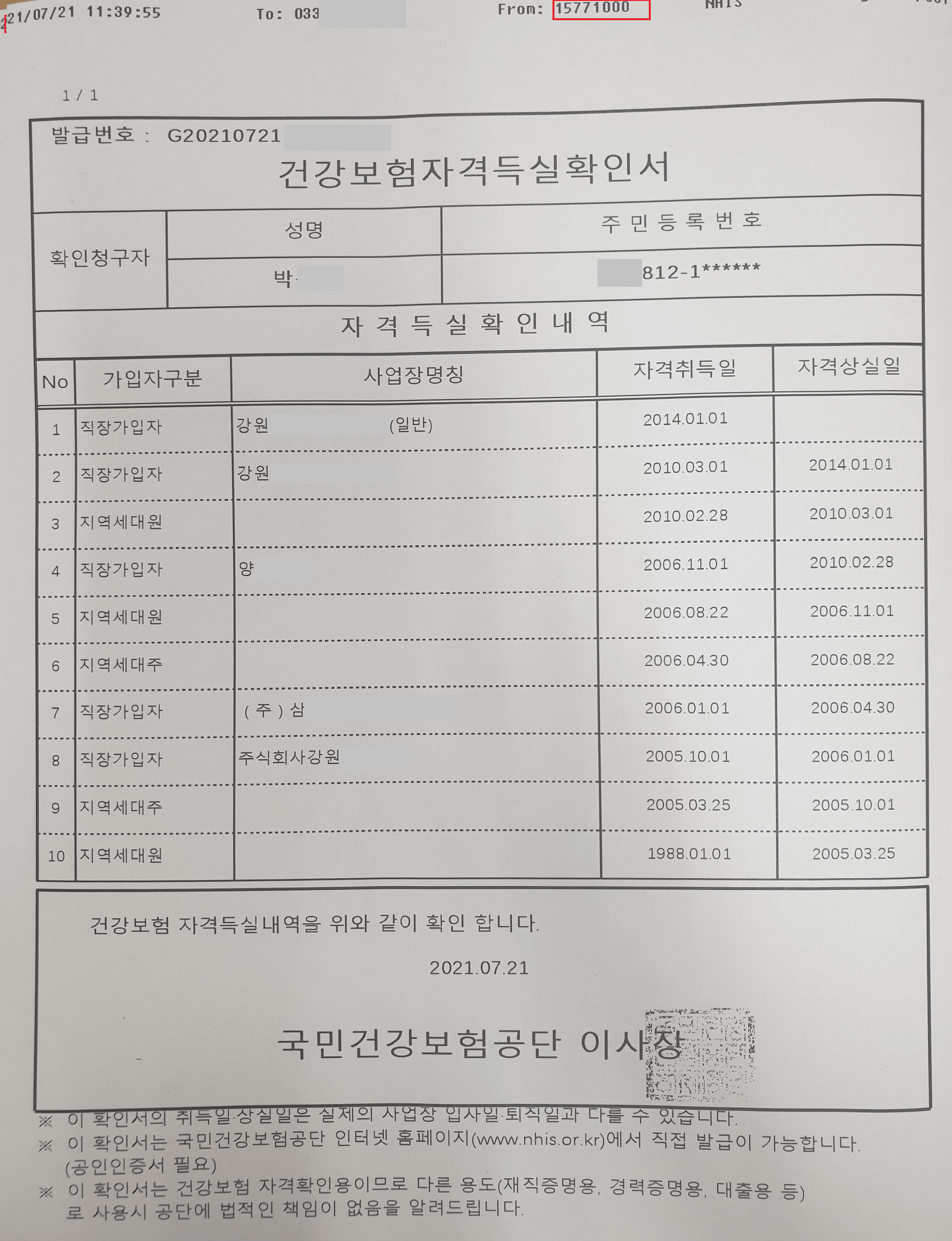팩스 보내기 클릭 후 인터넷 발급과 동일하게 1분안에 건강보험자격득실확인서가 고객센터에서 → 입력한 팩스번호로 수신되었습니다.