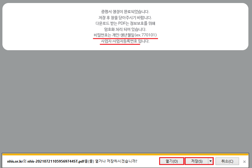 프린터 인쇄 발급을 클릭하면 증명서 생성이 완료되며, 아래 열기 클릭 후 암호 입력(개인 생년월일)을 해주세요. 다음 파일 열기 하여 건강보험자격득실확인서를 출력하면 완료됩니다. 그리고 아래 pdf파일을 저장을 클릭하여 하드디스크나 usb에 저장할 수 있으니 참고하여 주세요.