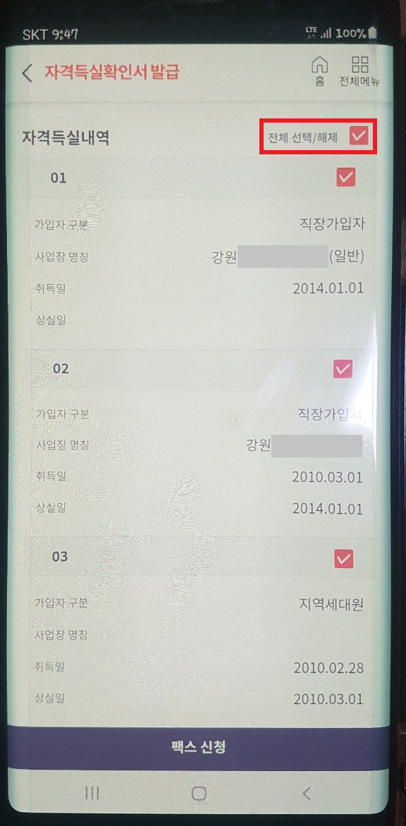 조회 후 아래 자격득실 내역에서 직장가입자, 지역가입자 구분해서 가입자구분, 사업장명칭, 취득일, 상실일 등이 자세하게 나와있습니다. 이제 팩스 신청을 하기위해 자격득실내역 우측에 전체 선택/해제 □ 박스에 체크를 하고 이상이 없다면 팩스신청을 클릭해 주세요.
