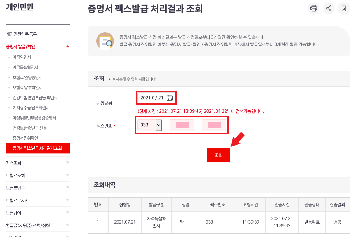 팩스발급 처리 결과 조회는 국민건강보험공단 홈페이지 상단에 민원 여기요 → 개인 민원 → 증명서 발급ㆍ확인 → 증명서 팩스발급 조회에서 보낸 날짜, 팩스번호 입력 후 조회를 클릭하면 상세하게 확인할 수 있습니다.
