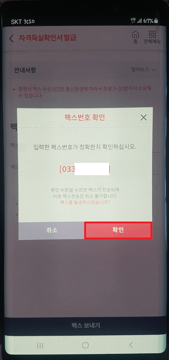 팩스 전송 방법은 자격득실확인서를 출력하지 않고 내가 팩스를 받고자 하는 곳에 번호를 입력하면 전송할 수 있습니다. 증명서 팩스 전송 아래 번호 입력란에 정확하게 팩스 받을 번호를 입력하고 전송을 클릭해 주세요. 그리고 번호를 2번 입력하는 이유는 잘못된 팩스번호로 인하여 개인정보가 유출될 수 있어 확인차 2번을 입력하는 것이니 다시 한번 정확하게 확인하고 입력해 주세요.